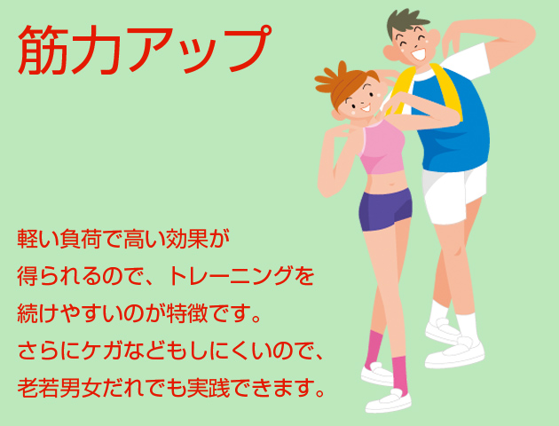 高重量、高レップの運動を必要としない為、通常のウエイトトレーニングなどを実施する際に、フォームの安定が難しい方、筋力がない方、何かしらの疾病や制限がある方、運動経験が少なくトレーニングフォームが取れにくい方)でも安易にトレーニングが可能です。