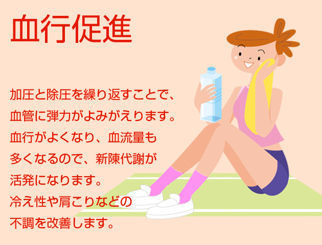毛細血管を拡張し、血管内皮の柔軟性を向上することで血液の運搬能力が向上し、血液が運んでいる『熱』『酸素』『栄養』その他免疫系の物質が、スムーズに全身(末端まで)に行き渡ることで、冷えや浮腫、コリなどにも加圧トレーニングが効果的なのです。